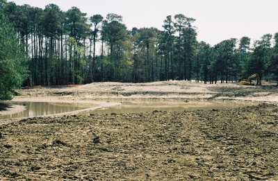 | A vestige of the par-3 sixteenth hole's former shoreline is visible in the left center of the photograph taken in April 2005 during the construction phase of Red Wing's renovation project. |