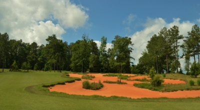 | It will not take long to discover the most prominent feature at Lonnie Poole: its waste bunkers. Here, on the par five 1st hole. |