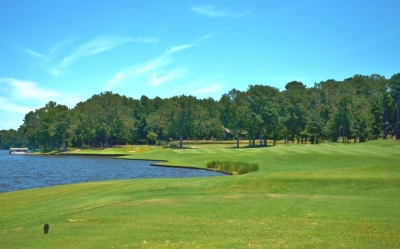 | The beautiful and challenging par four 5th hole suggests a draw off the tee - but too much hook will get you wet. |